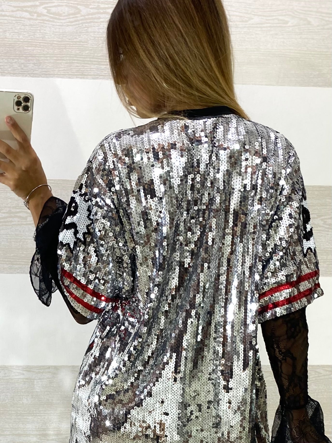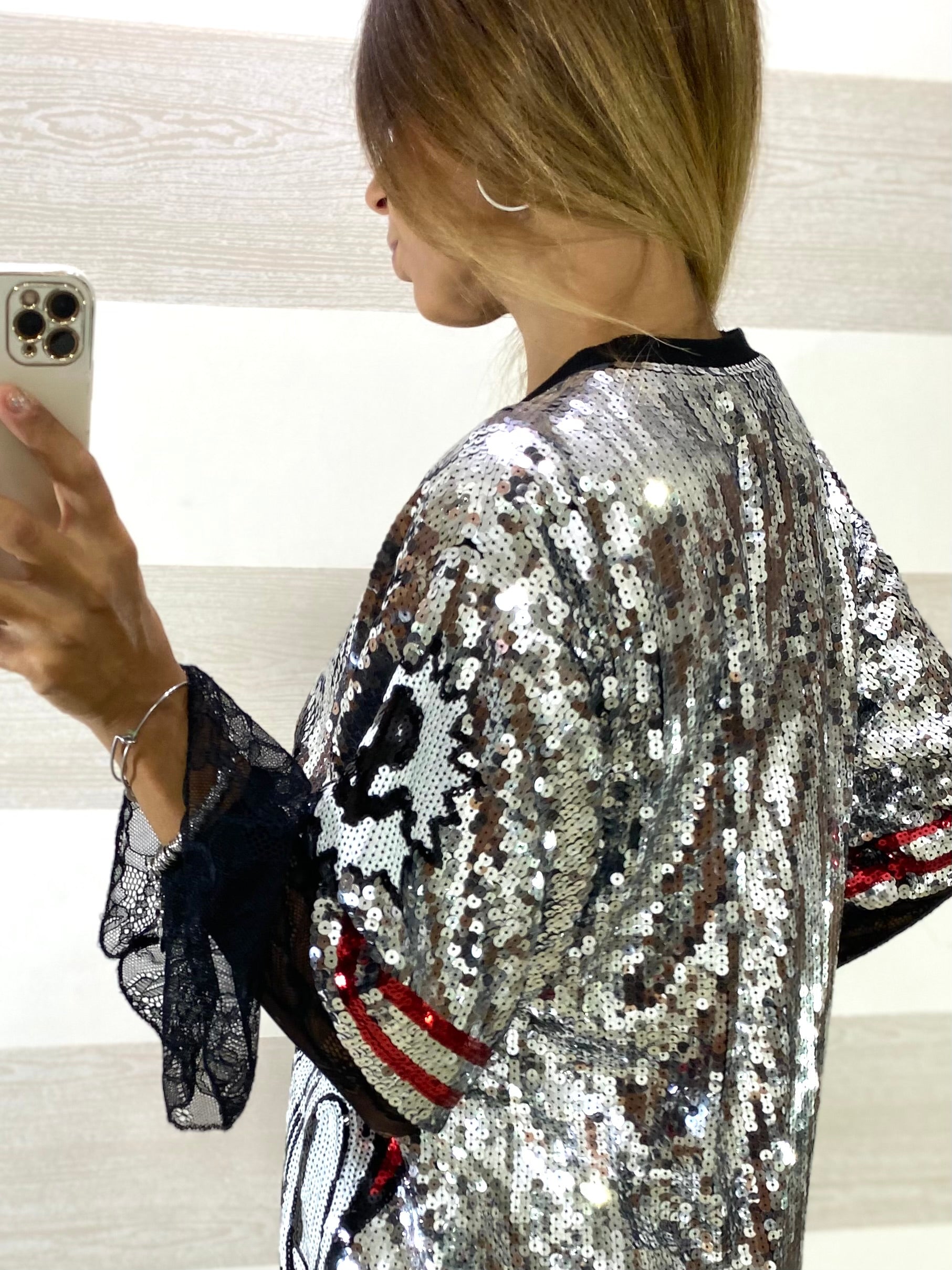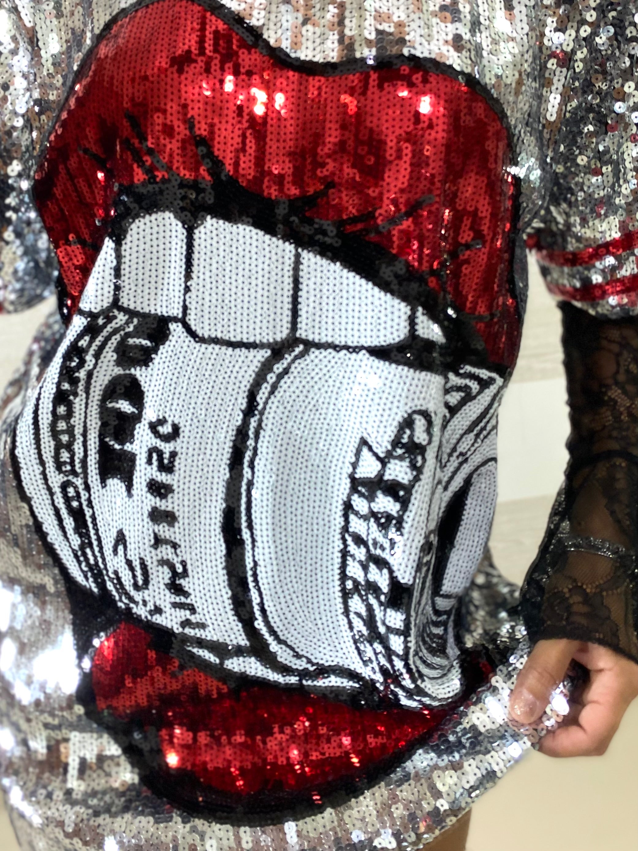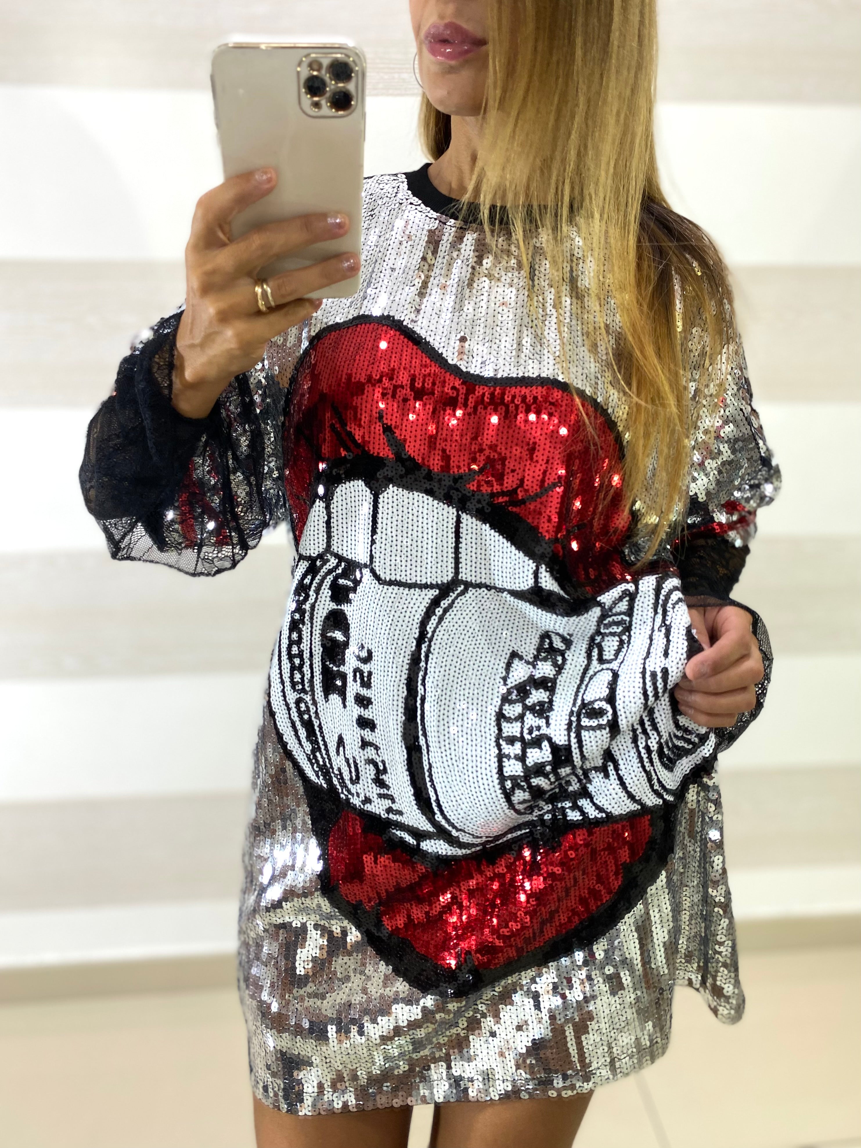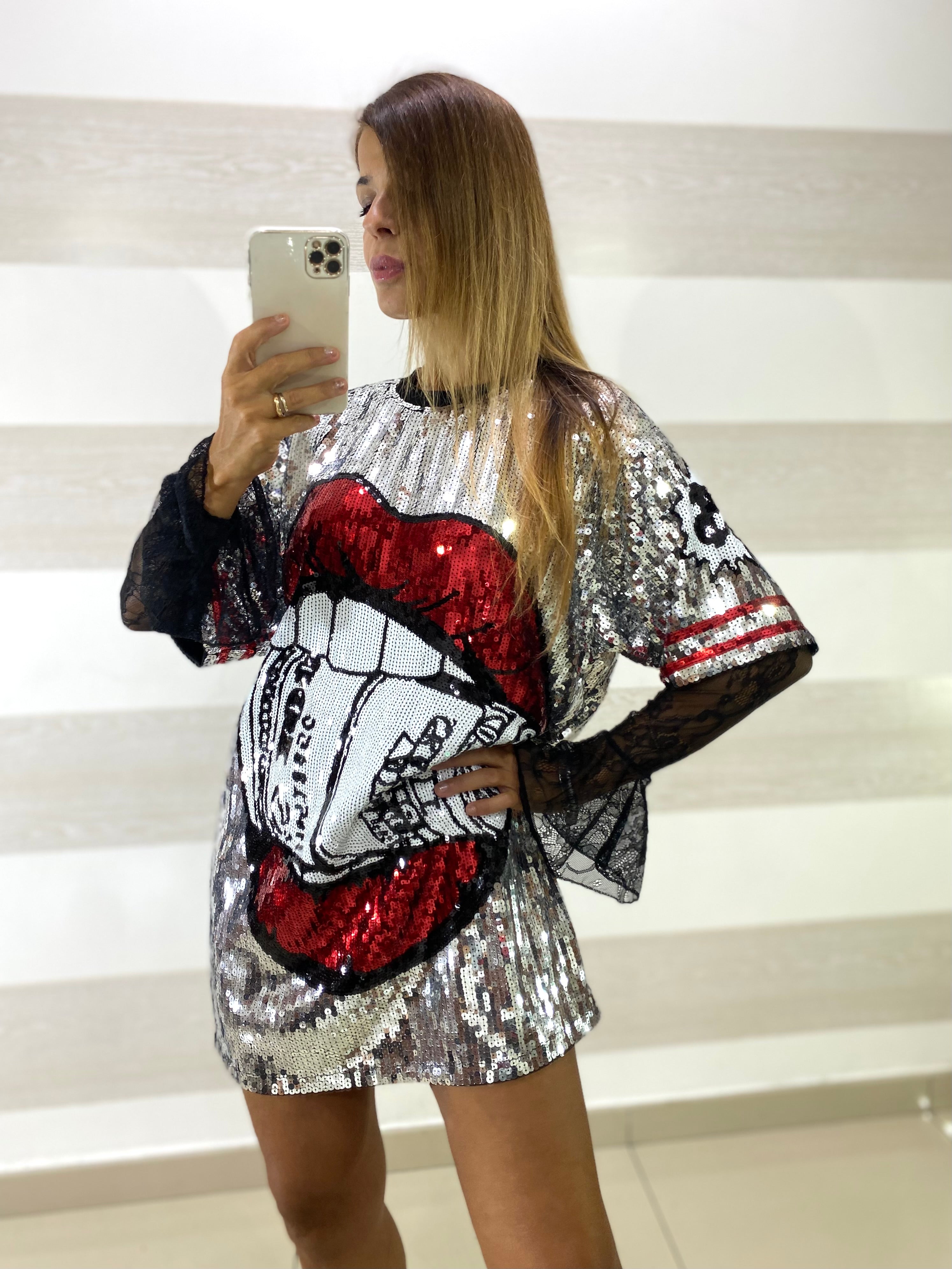 • Fondo in paillettes argento con disegno bocca e denti in paillettes rosse, bianche e nere