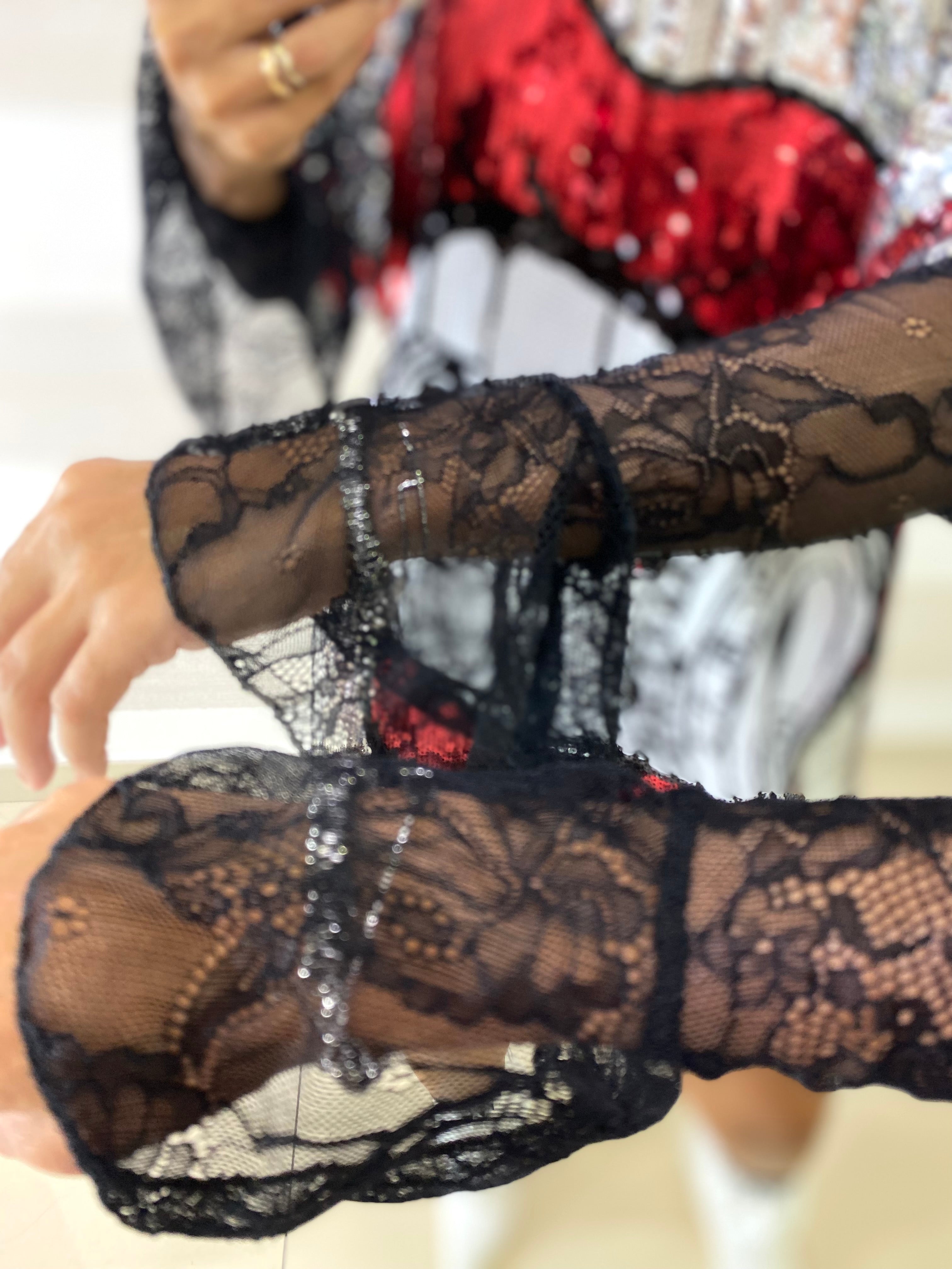 • Tessuto elasticizzato con paillettes argentate , rosse, bianche e nere