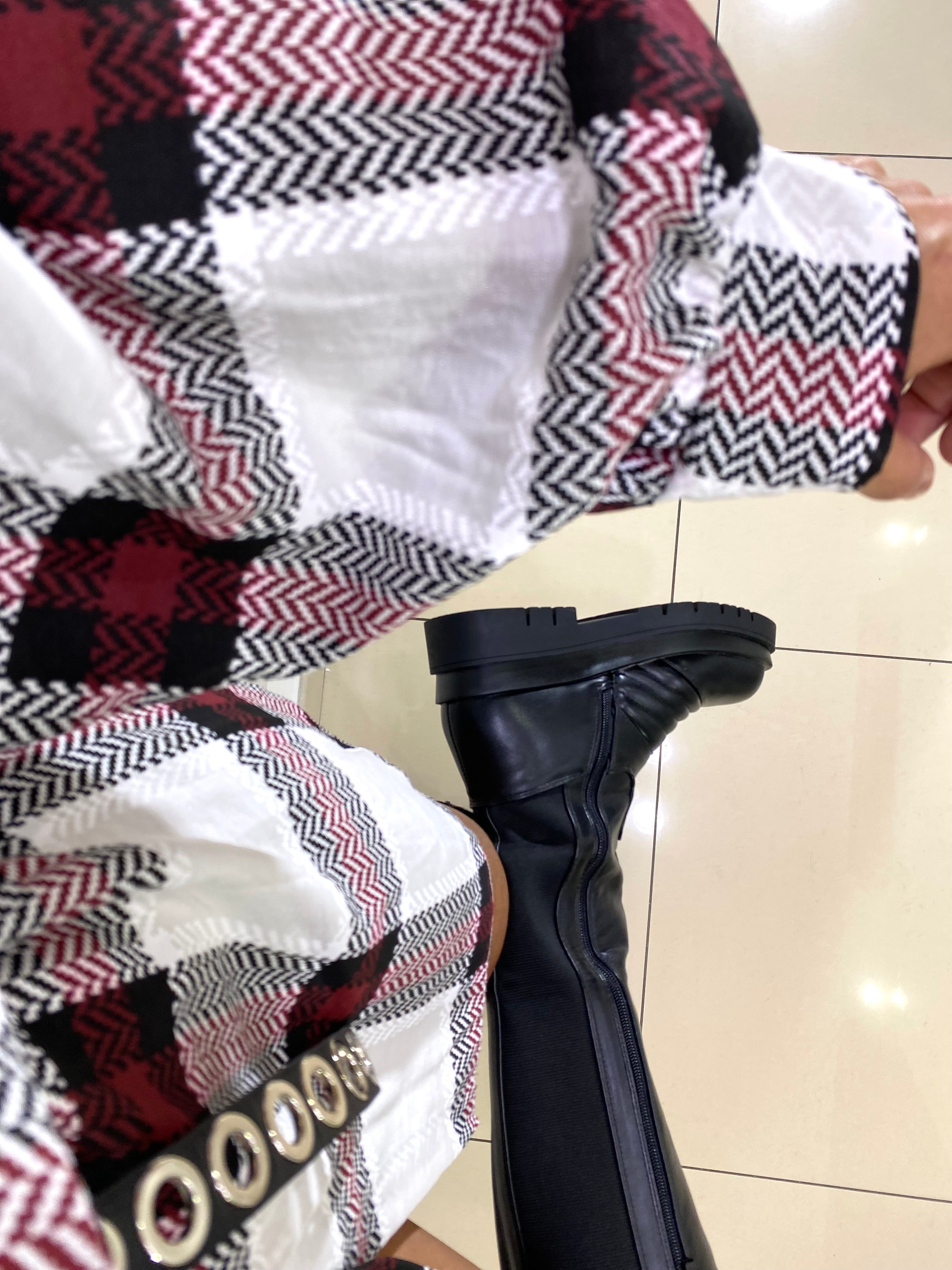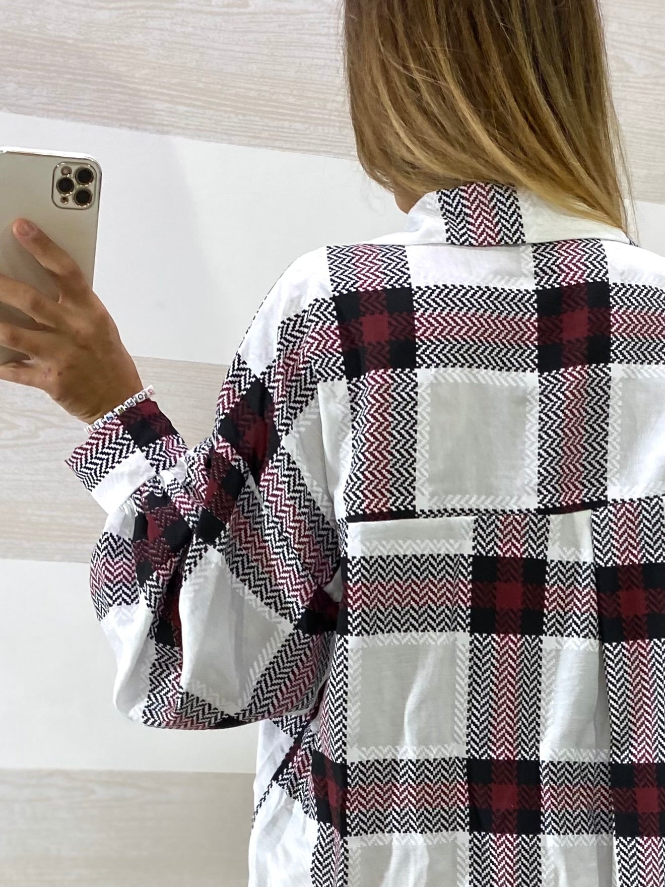 • Fondo beige oppure bianca con fantasia tartan a quadroni zigzag bordeaux e bianchi