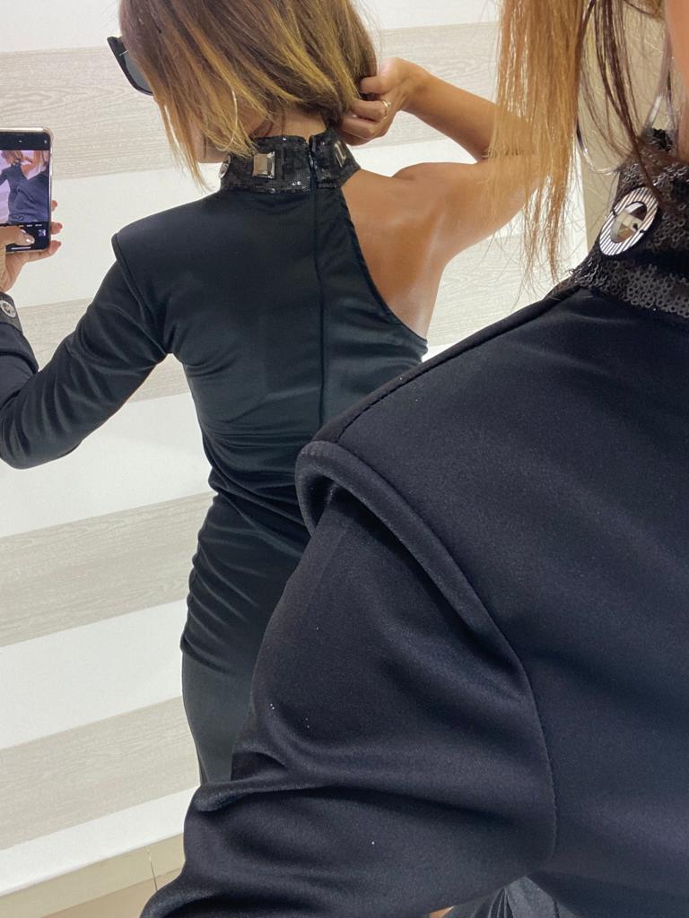 • Particolare per le micro paillettes nere e applicazioni sul colletto e sui polsi