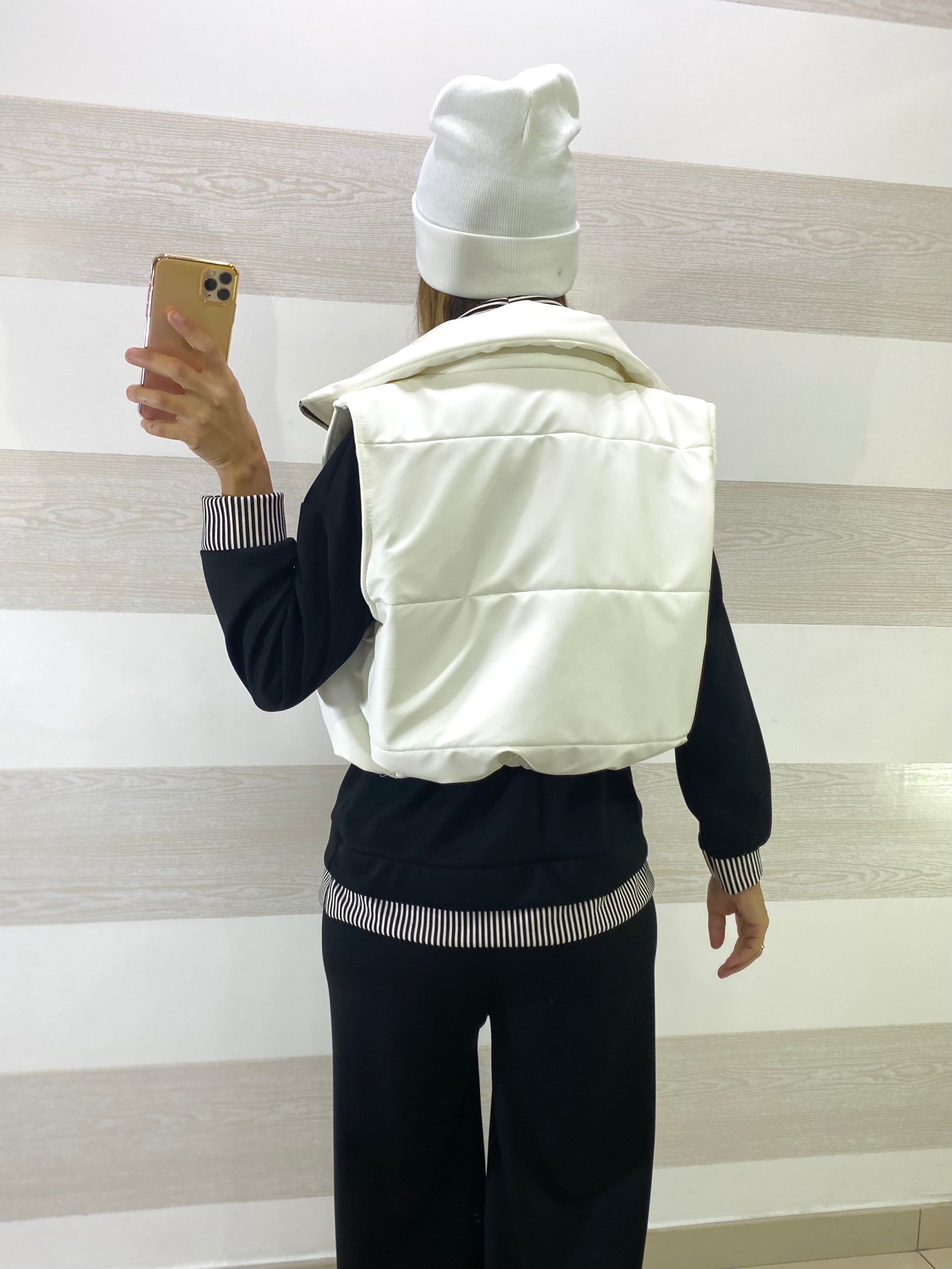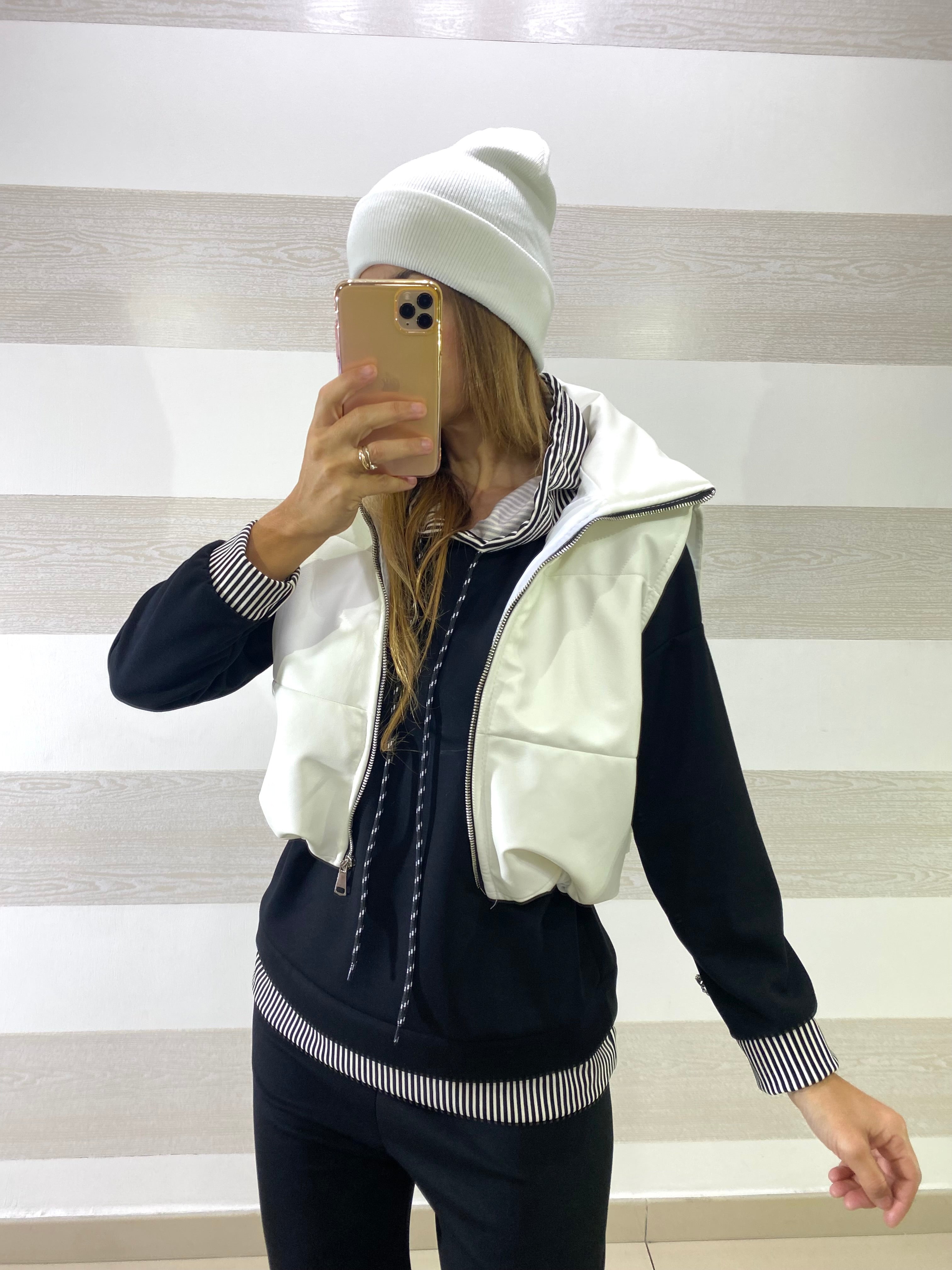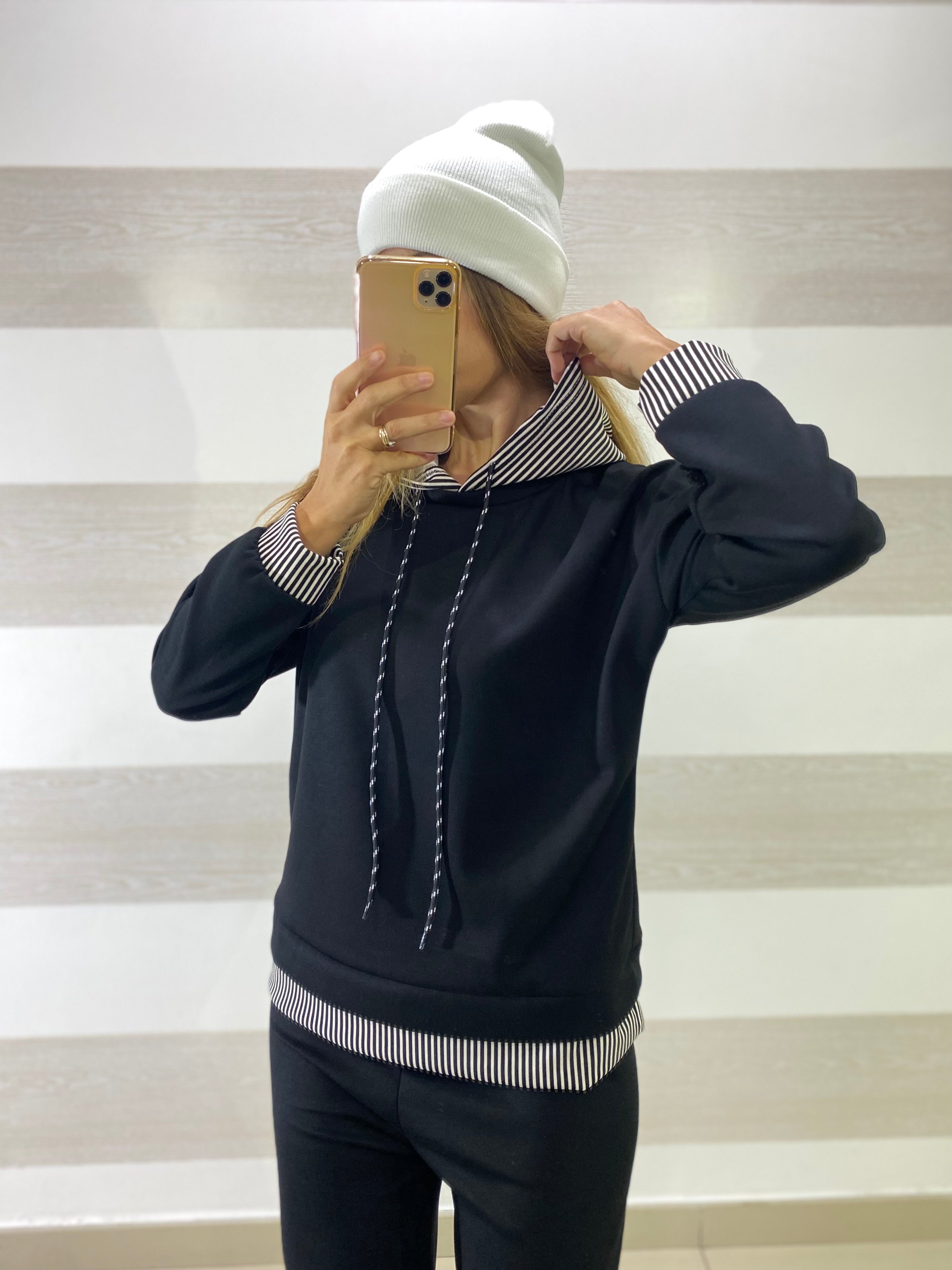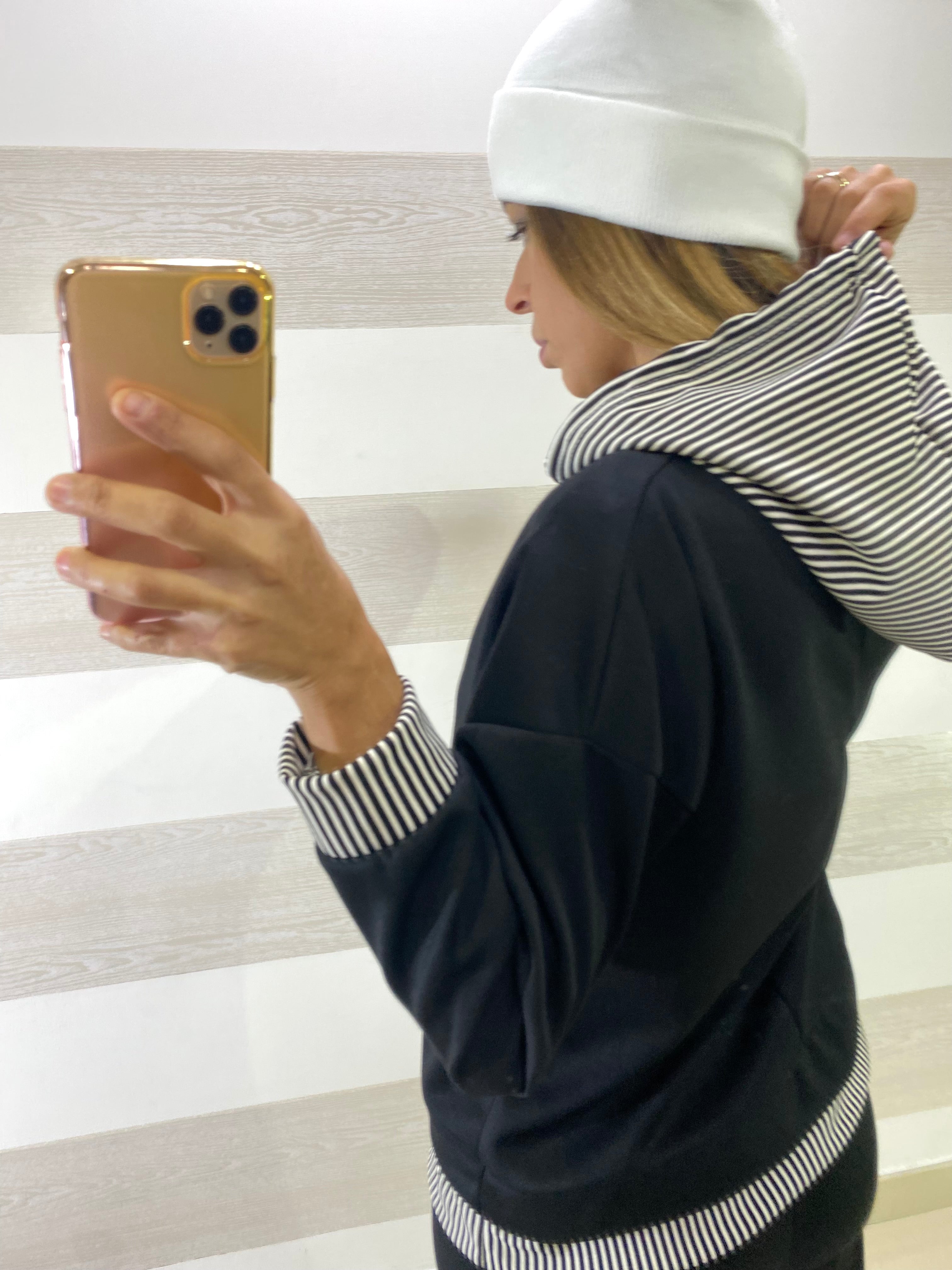 • Particolare per la finta maglia a righe bianche e nere che esce da sotto come ai polsi e al cappuccio