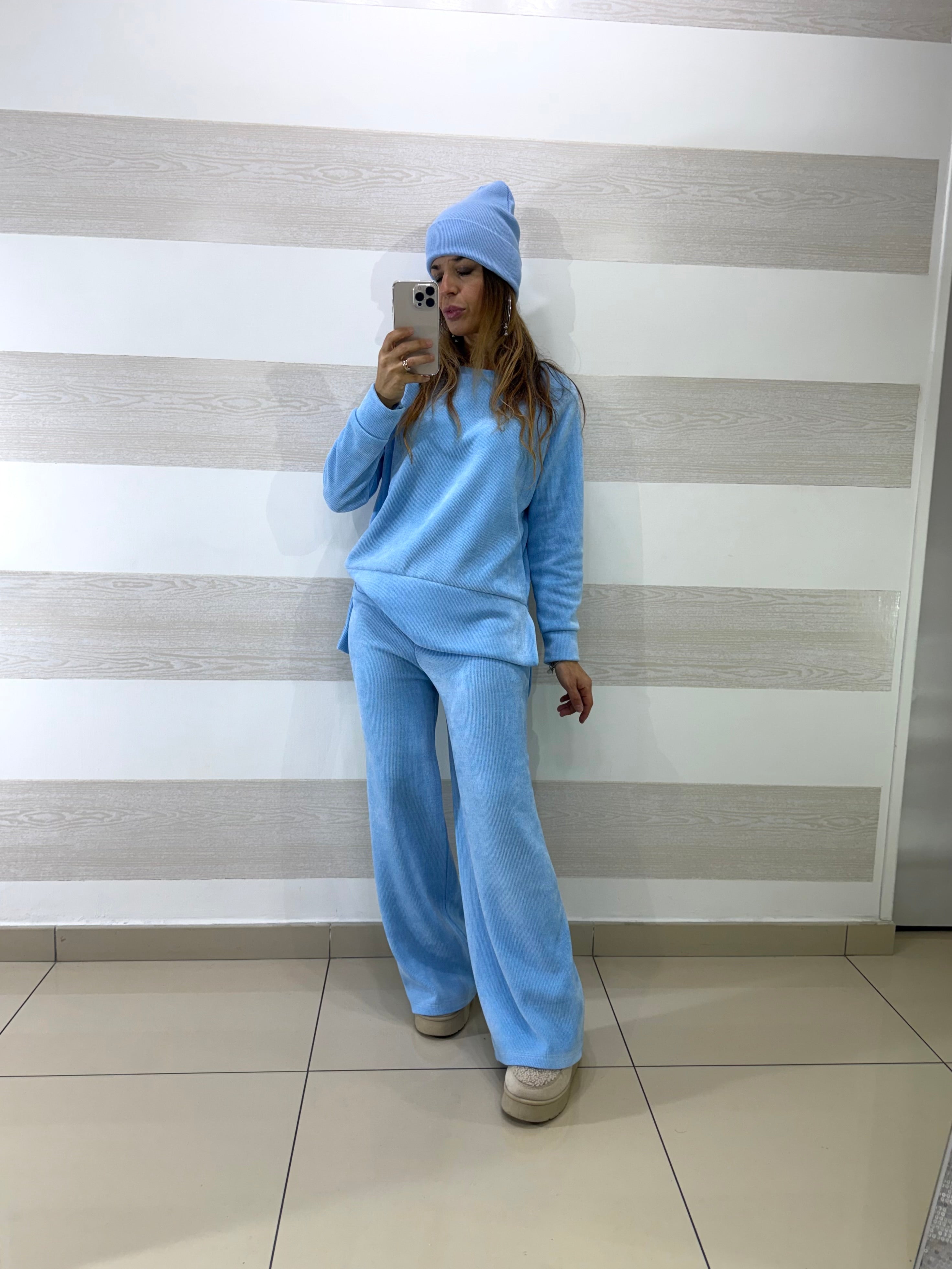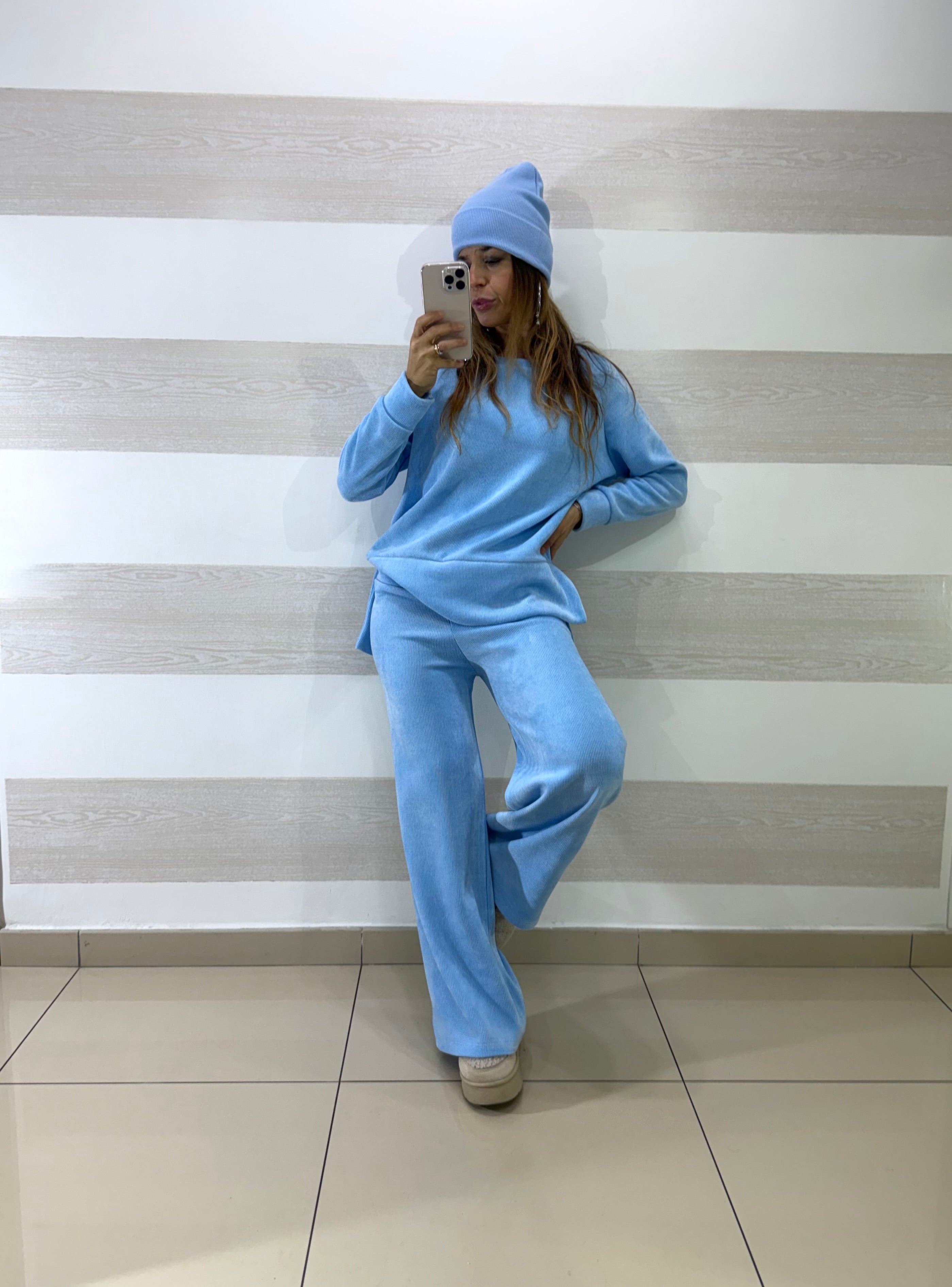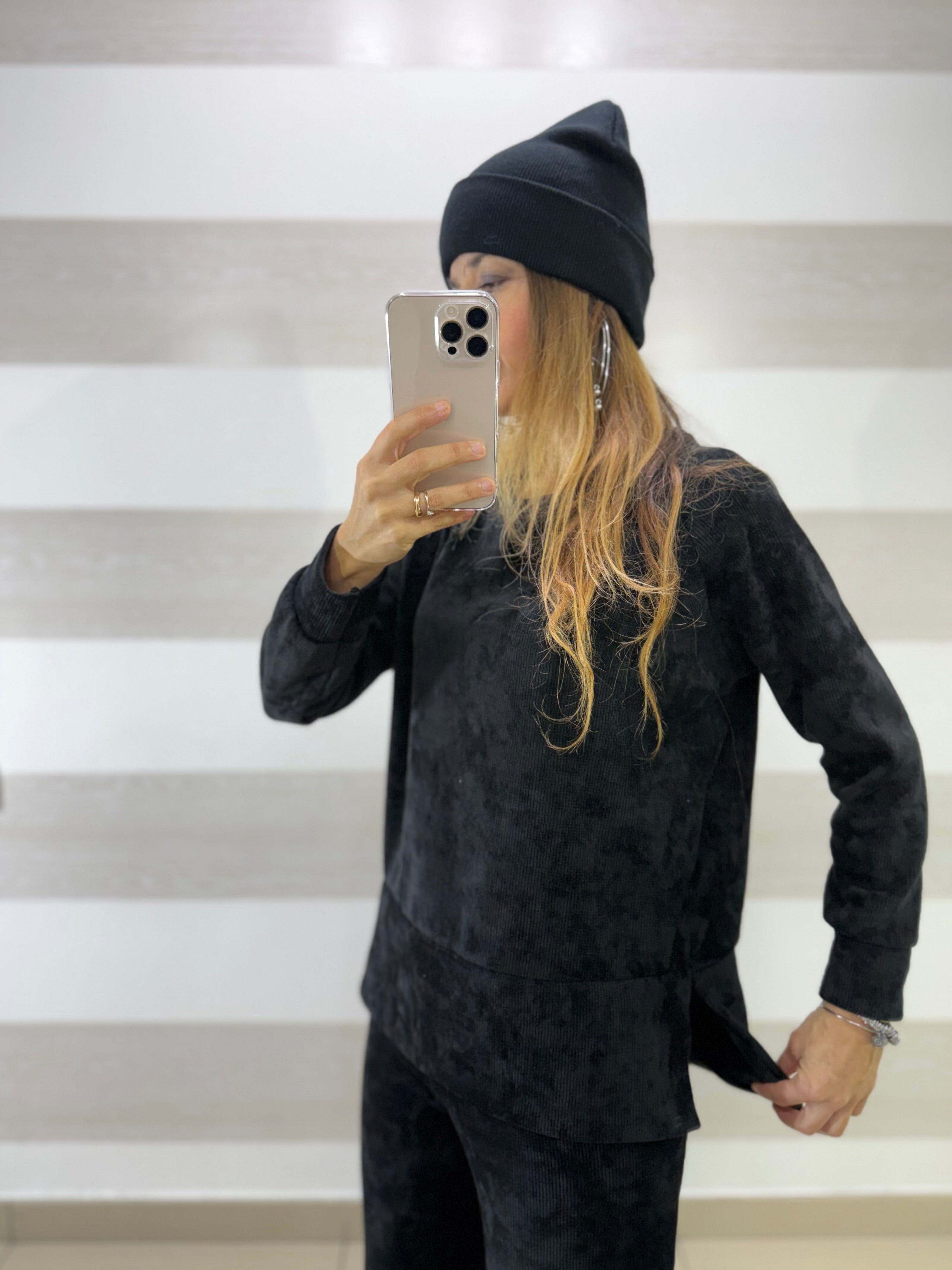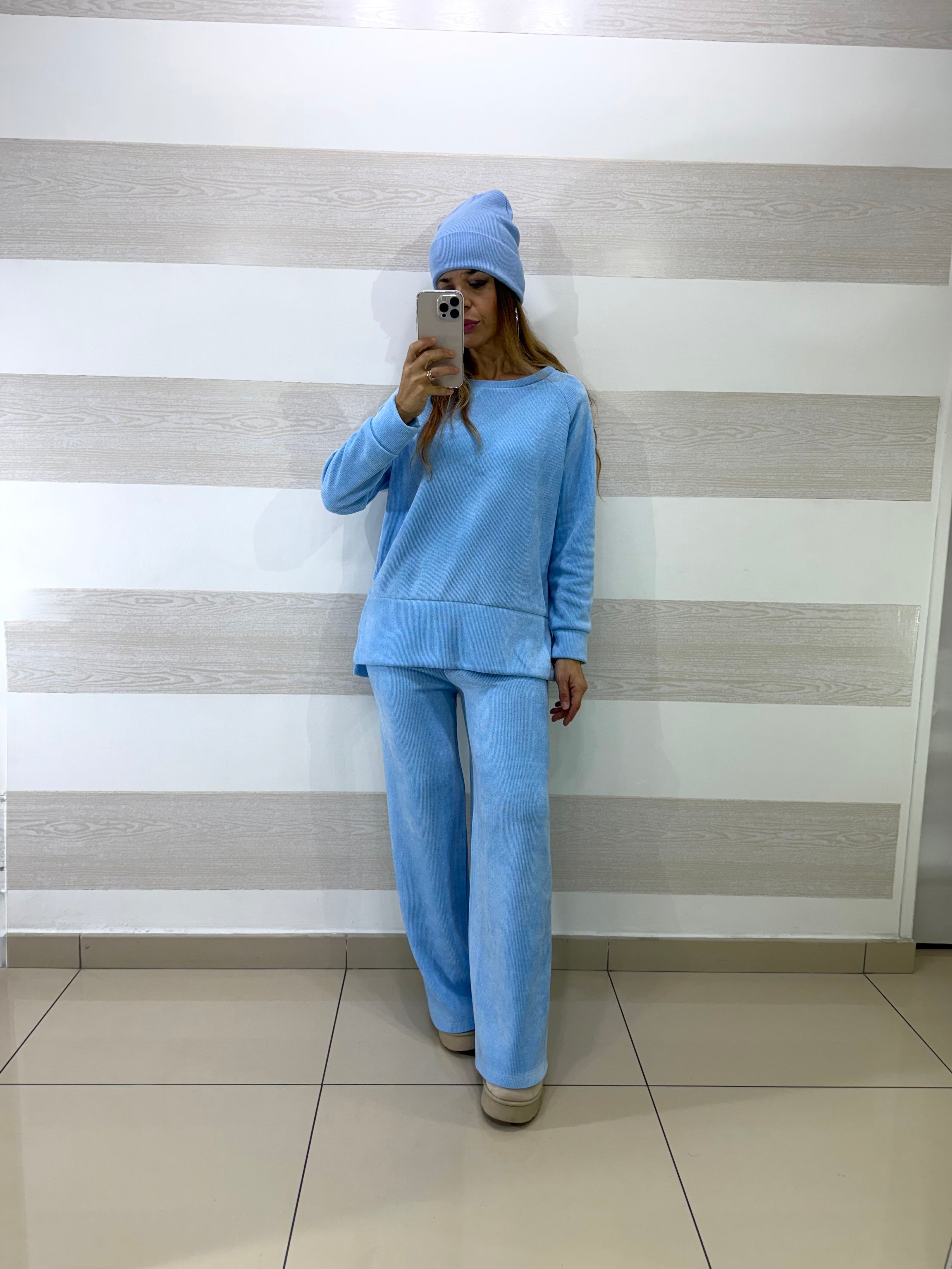 • Completo coord set elasticizzato in vellutino a costine composto da