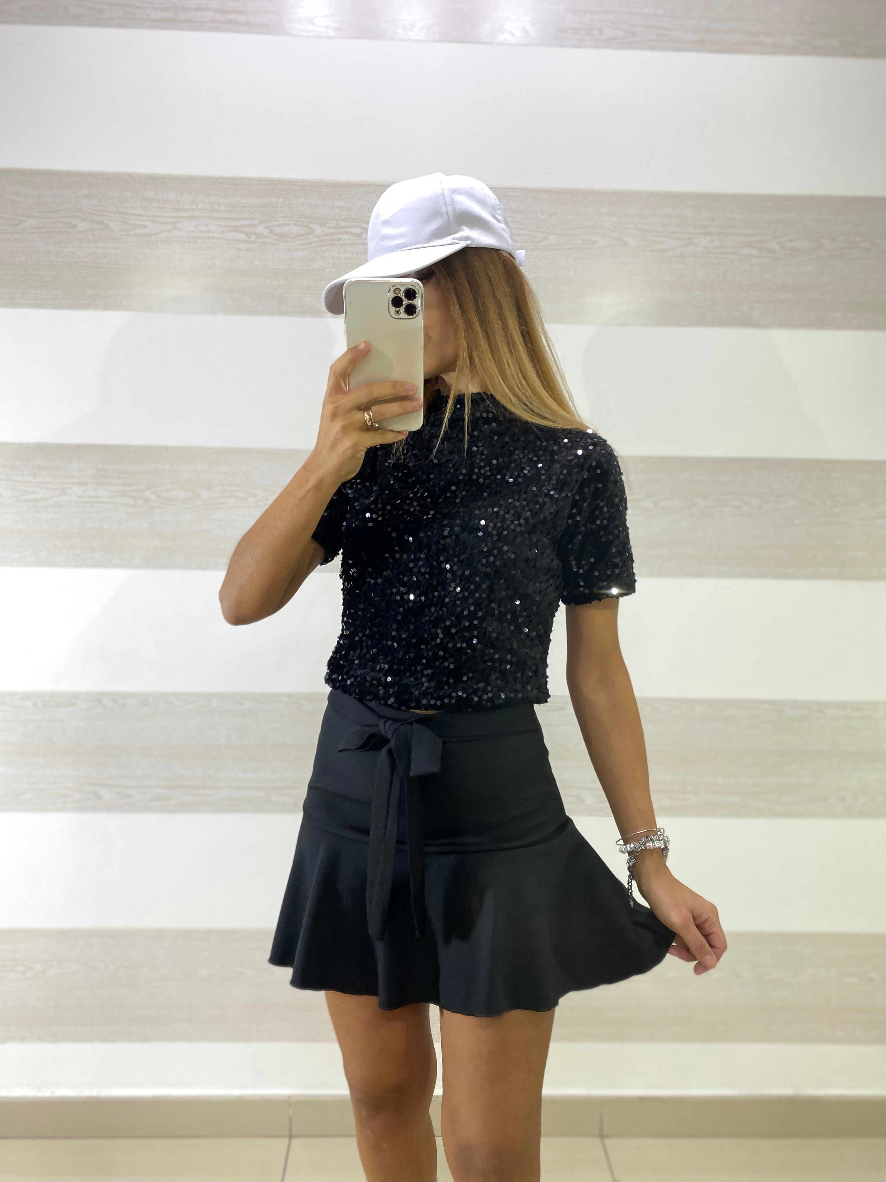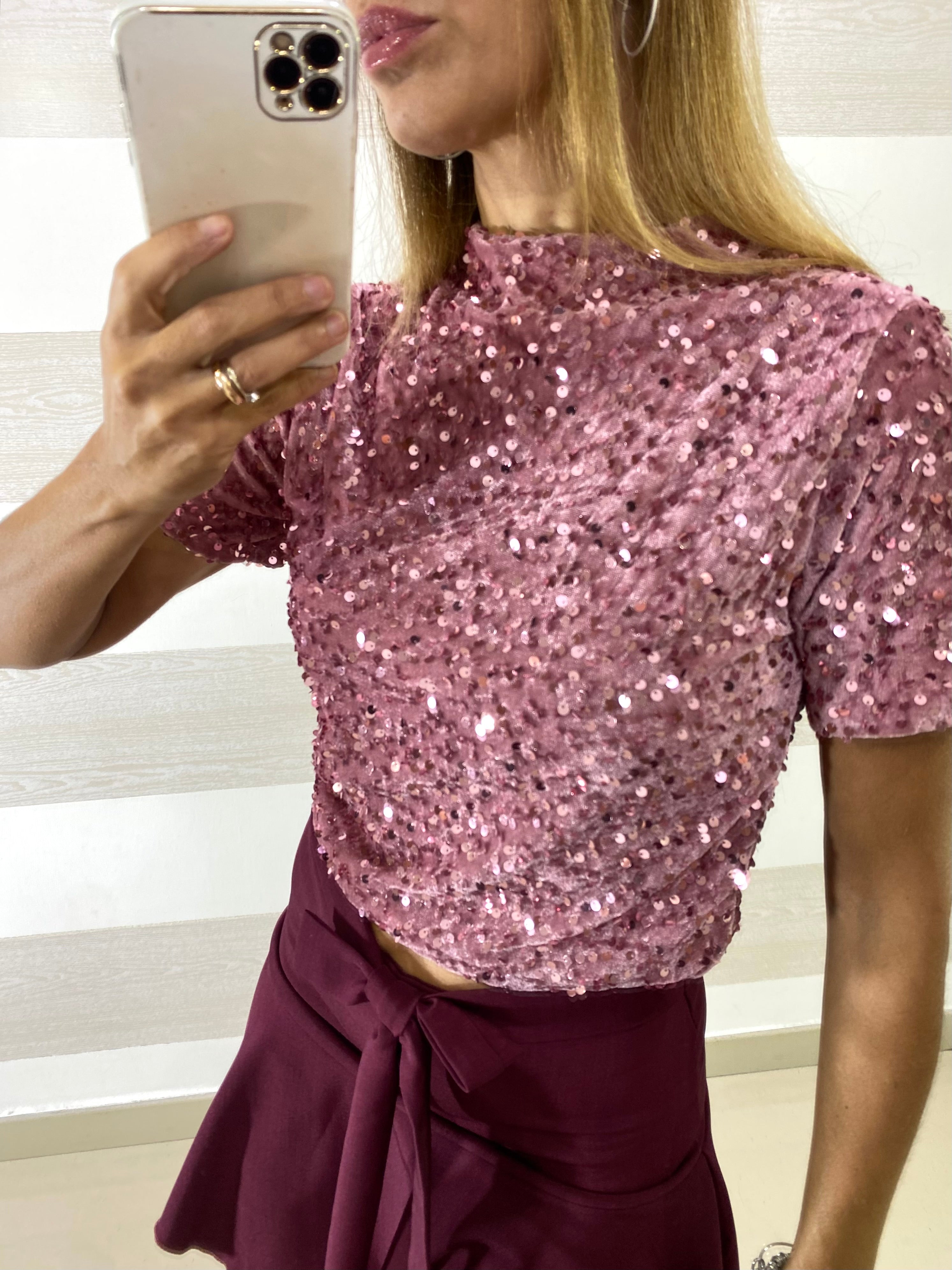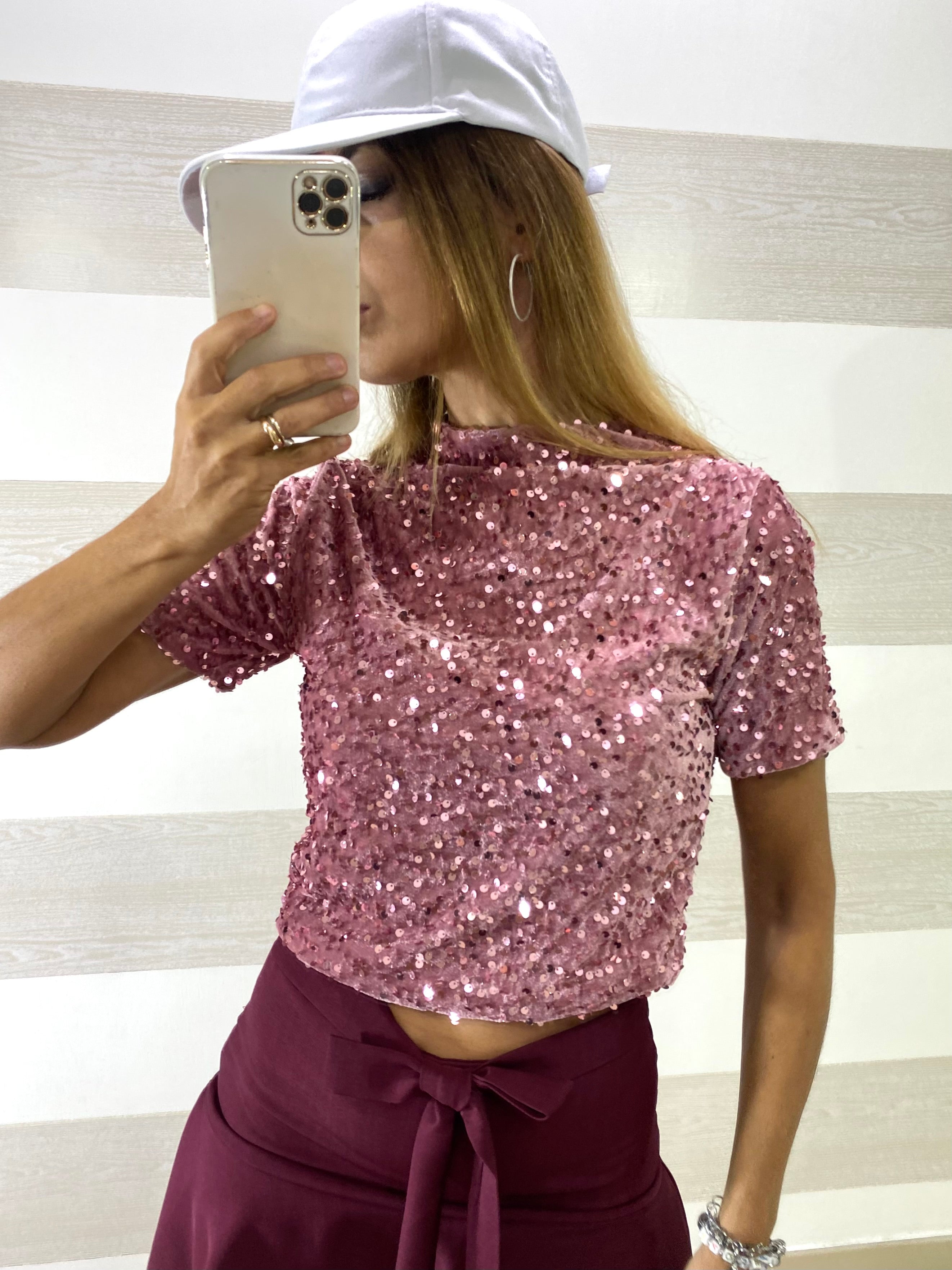 • Particolare il contrasto tra il velluto e le micro paillettes luccicose in tinta