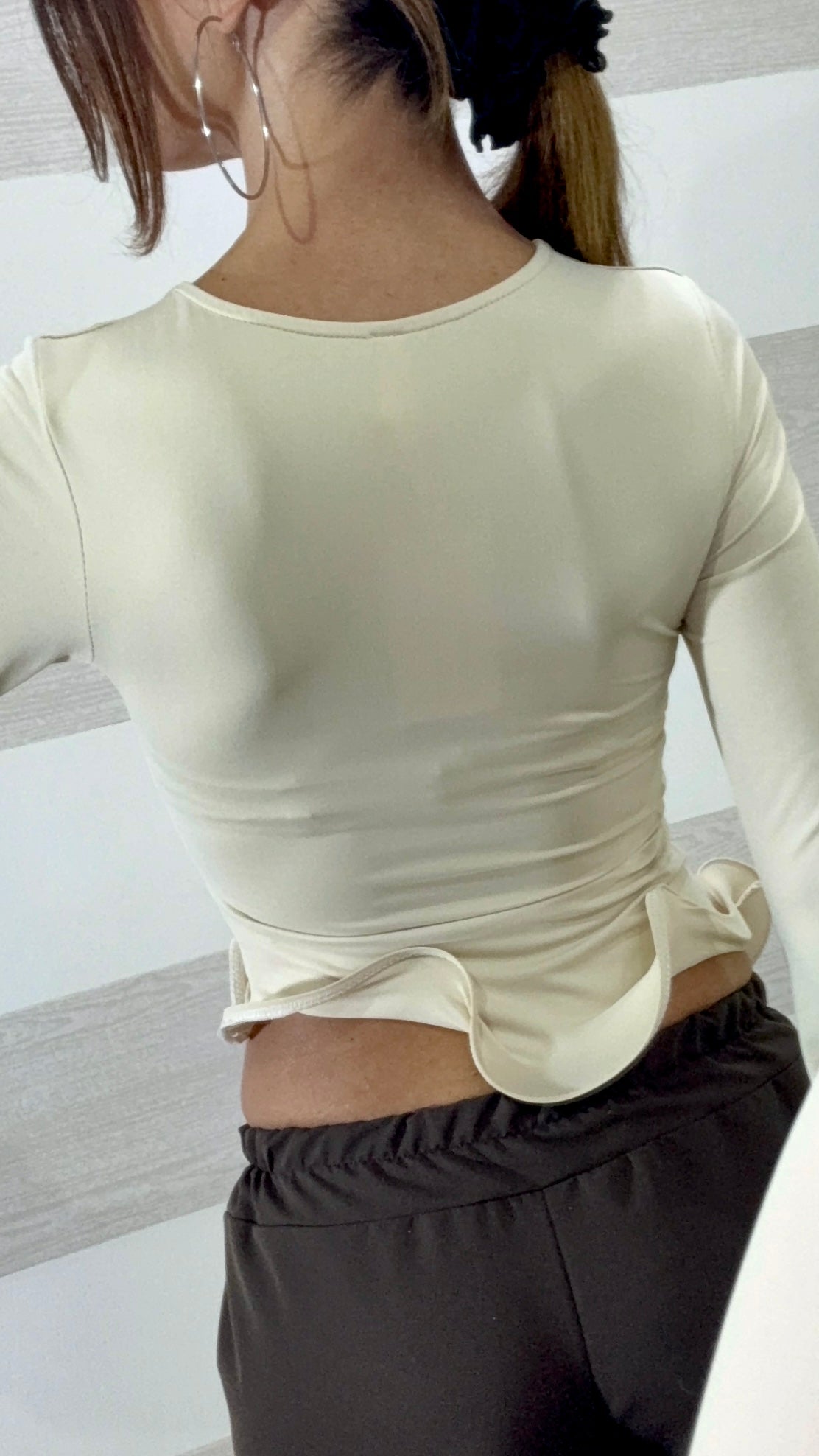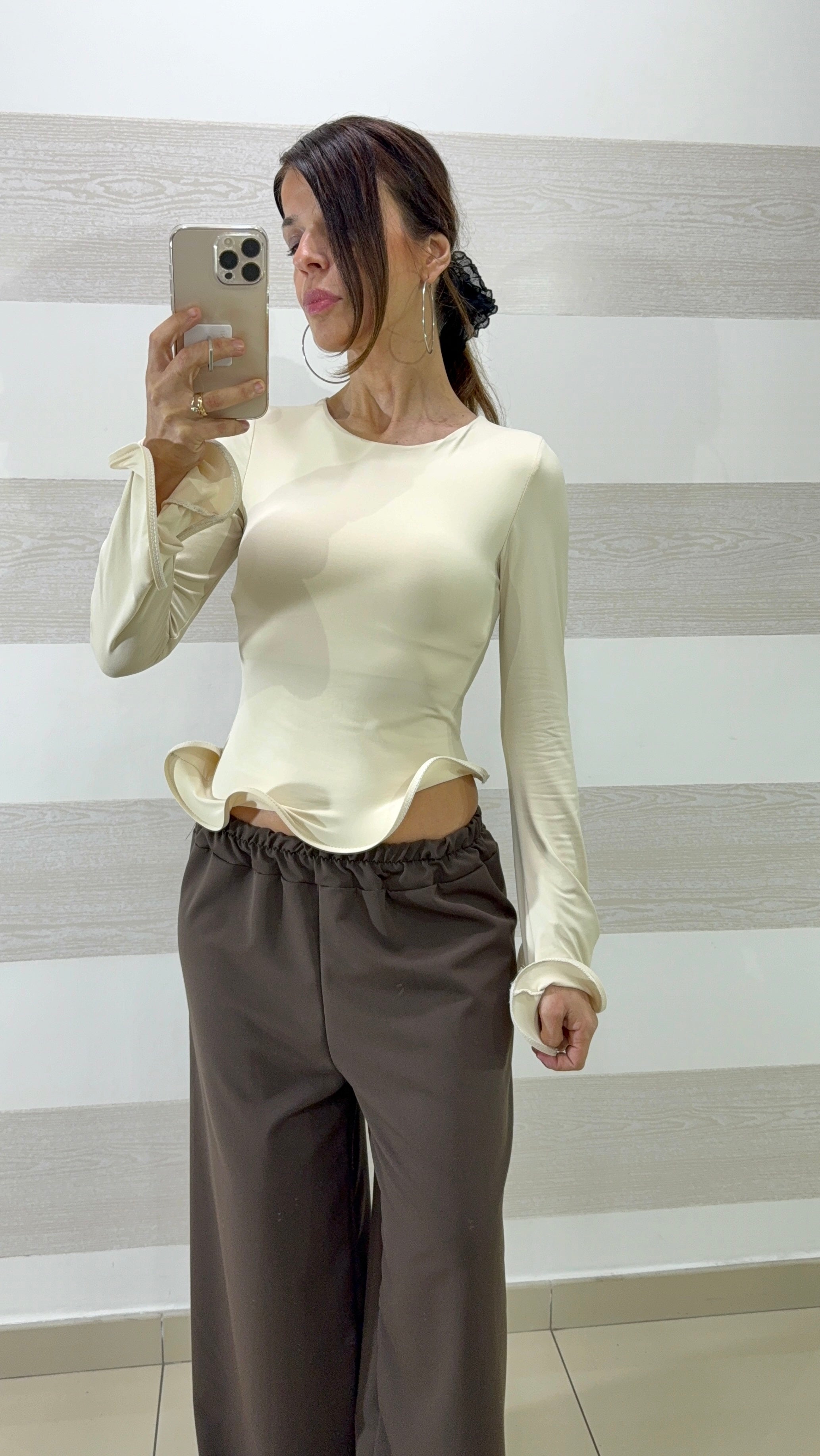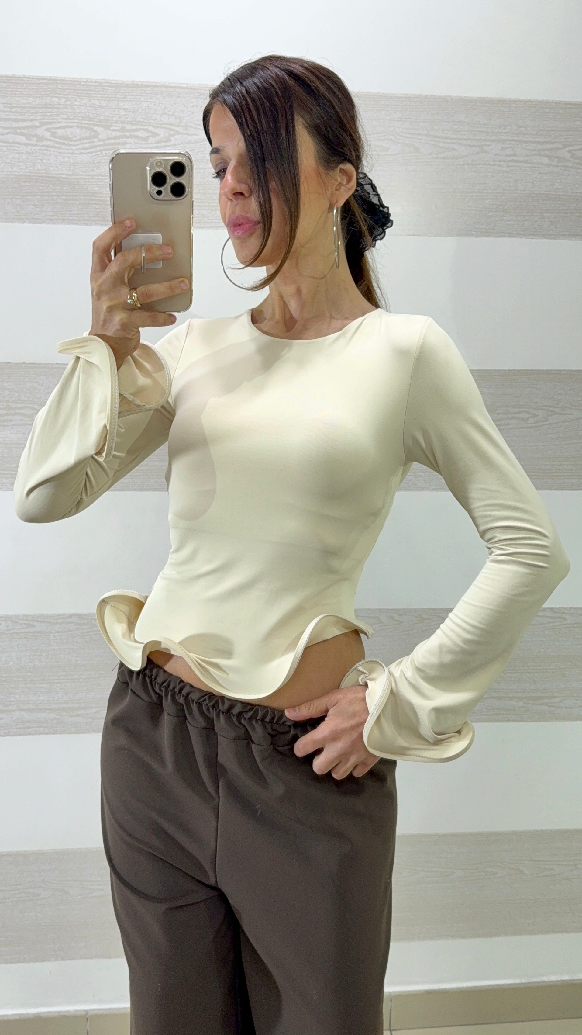• Orlo inferiore irregolare e sinuoso arricchito da una balza fluttuante