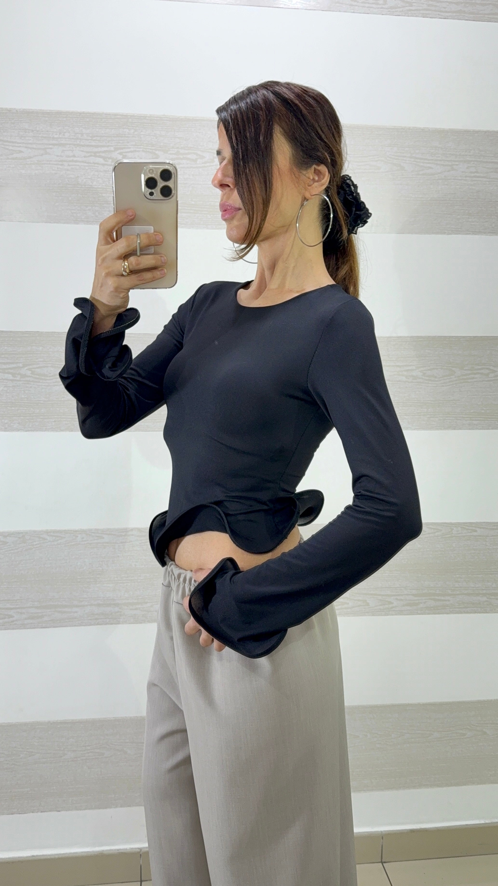 • Dettaglio di balze sulle maniche lunghe che richiama il motivo in vita