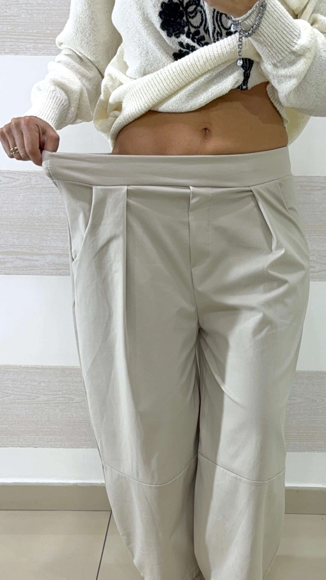 • Vita con bustino avanti e elastico dietro, indossabile sia a vita alta che bassa o normale