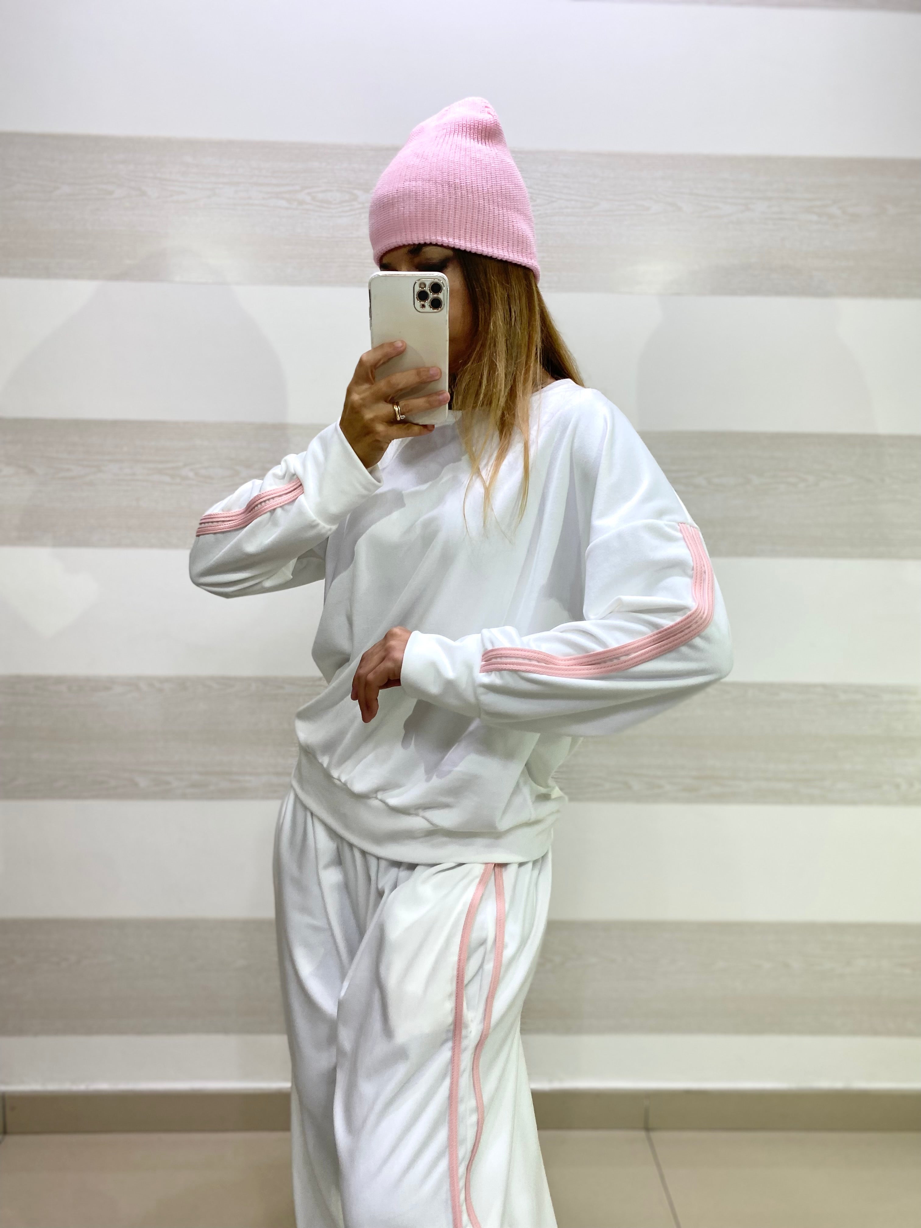 • Maniche lunghe con righe rosa
