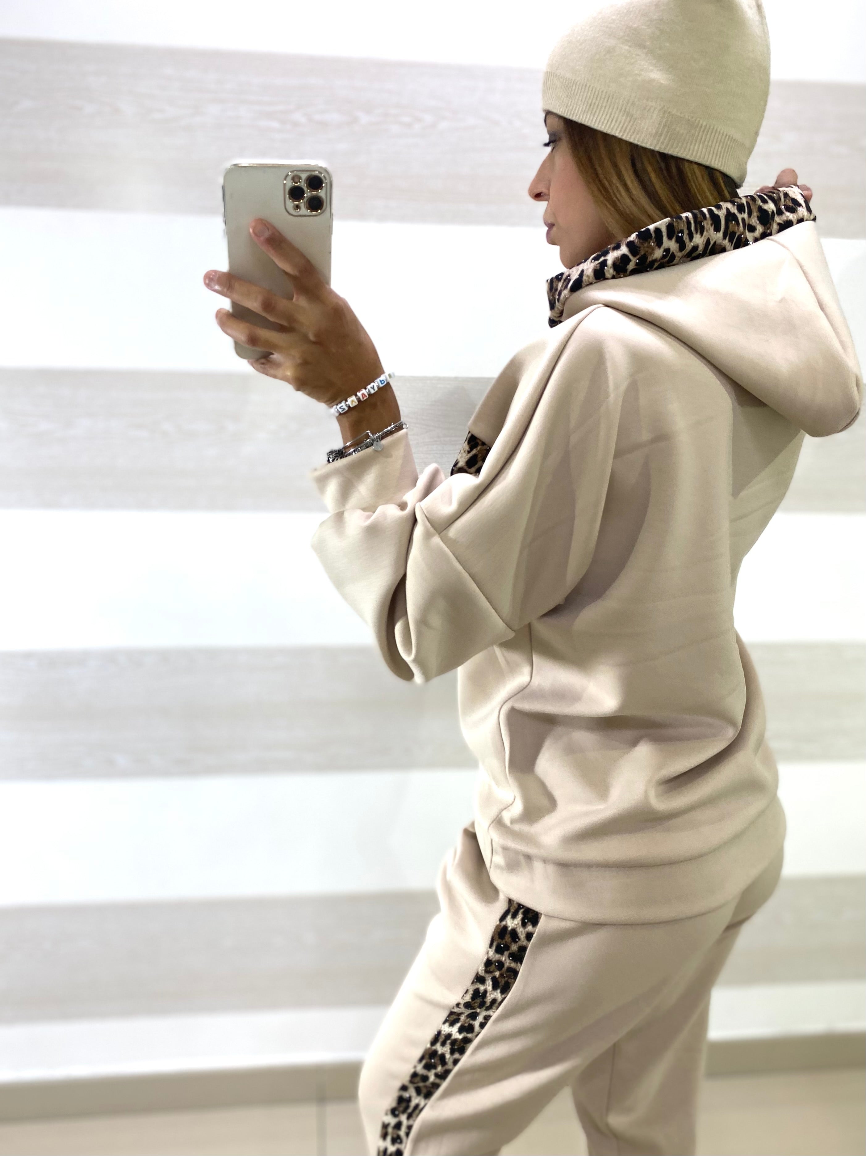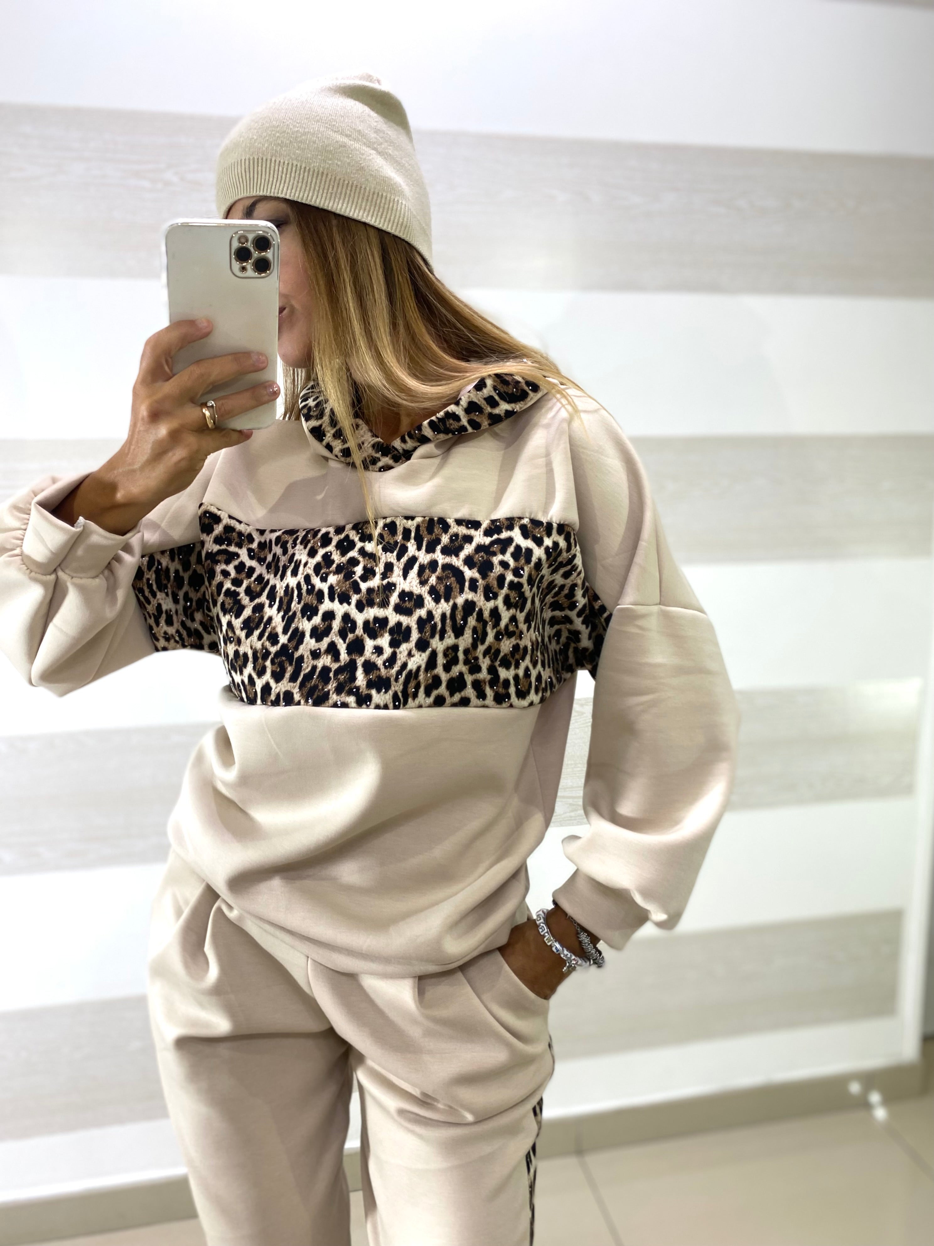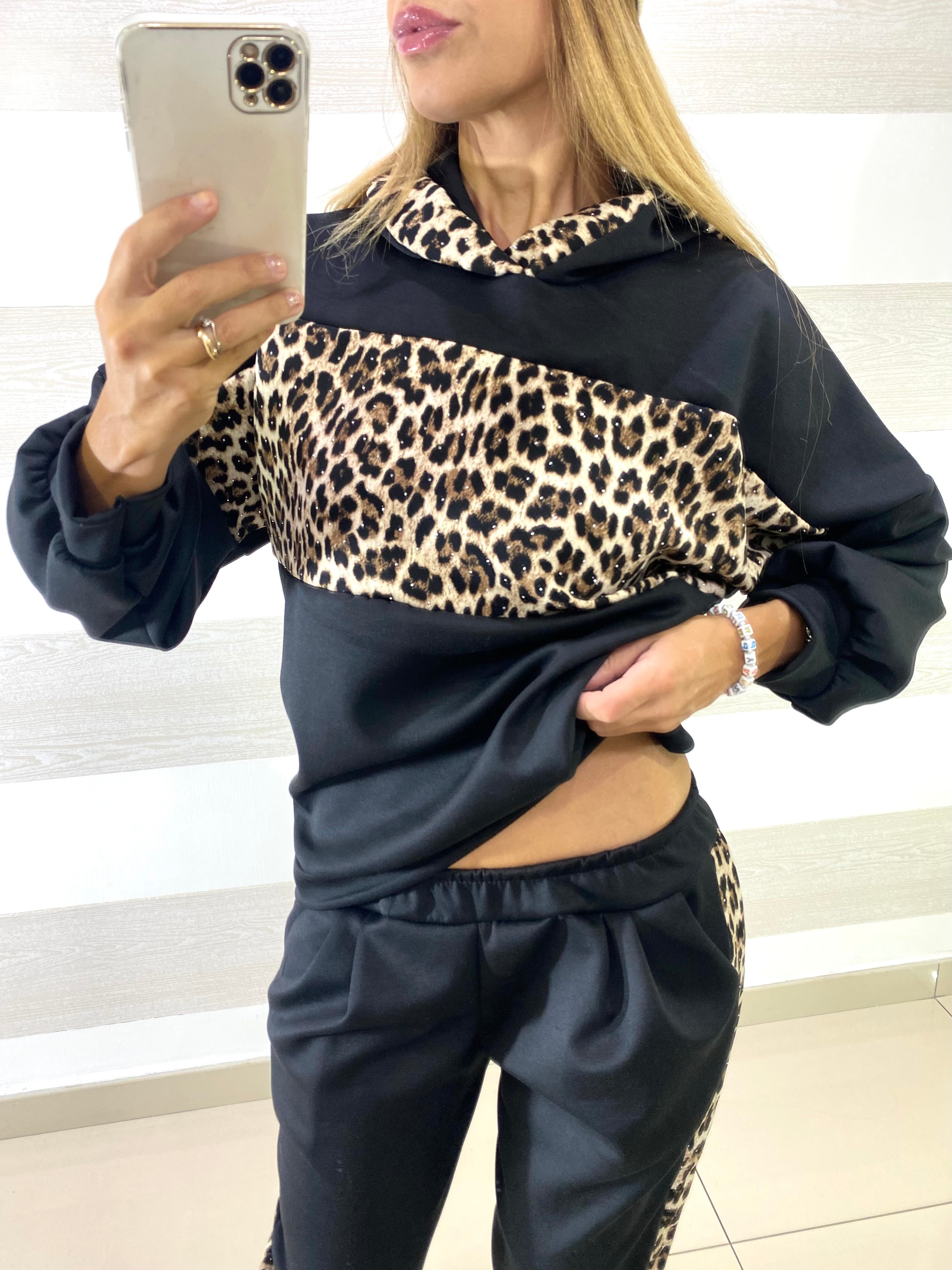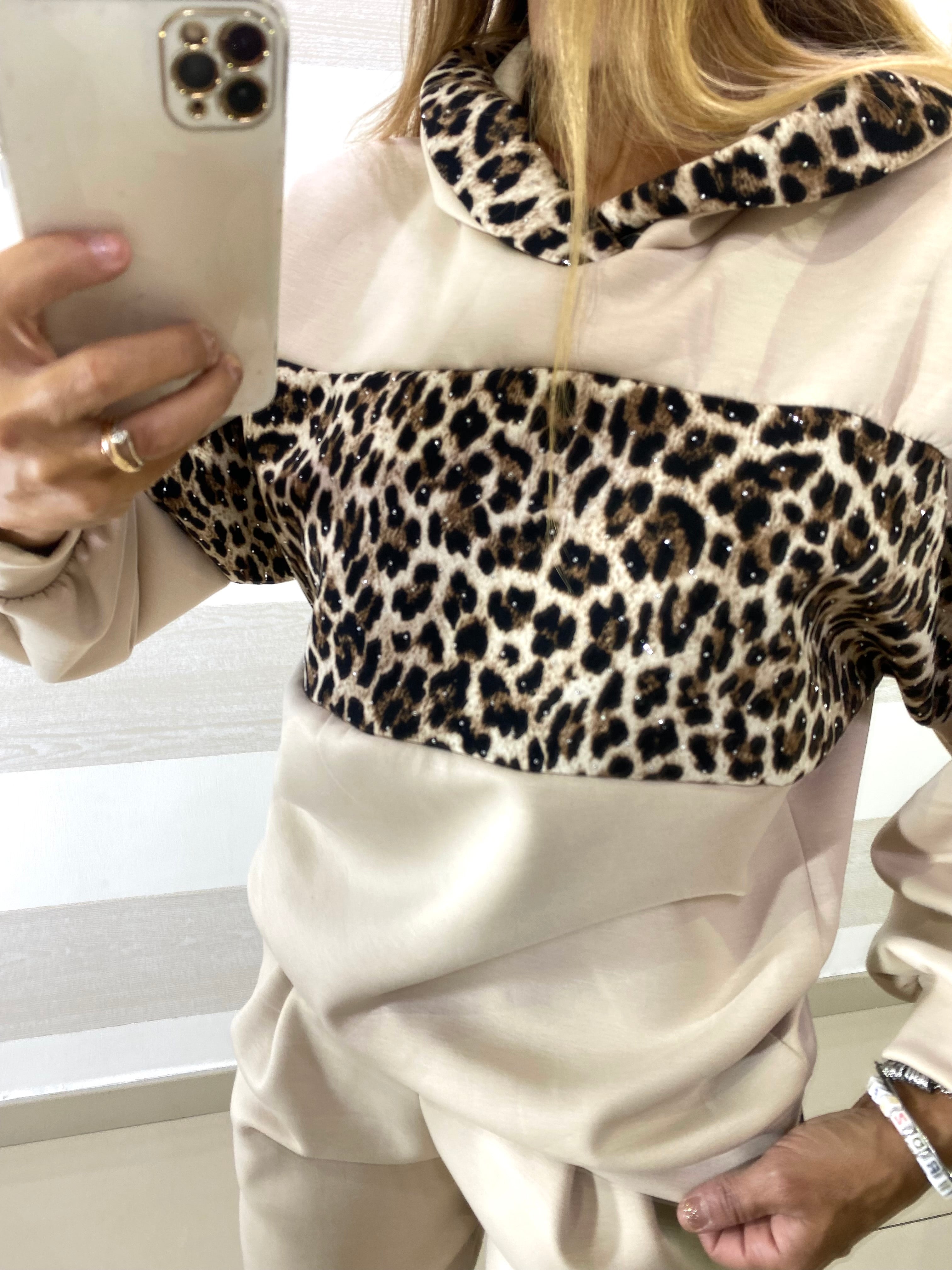 • Fascia animalier maculata e punti luce lungo la gamba esterna